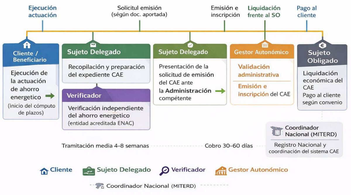 Cesión/venta a SO y pago al cliente. Una vez que los CAE han sido emitidos e inscritos en el Registro Nacional, se procede a la liquidación económica entre el Sujeto Obligado y el titular de la actuación (Cliente), normalmente coordinada por el Sujeto Delegado. Esta fase traduce los ahorros energéticos certificados en un ingreso monetario para el cliente, de acuerdo con las condiciones pactadas en el convenio.