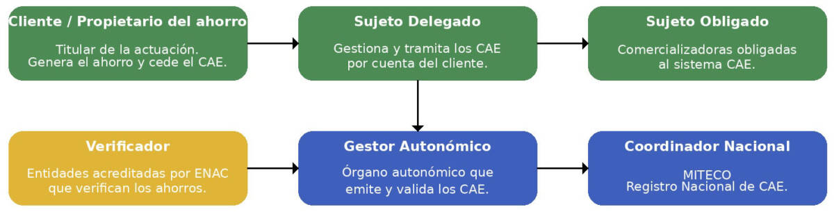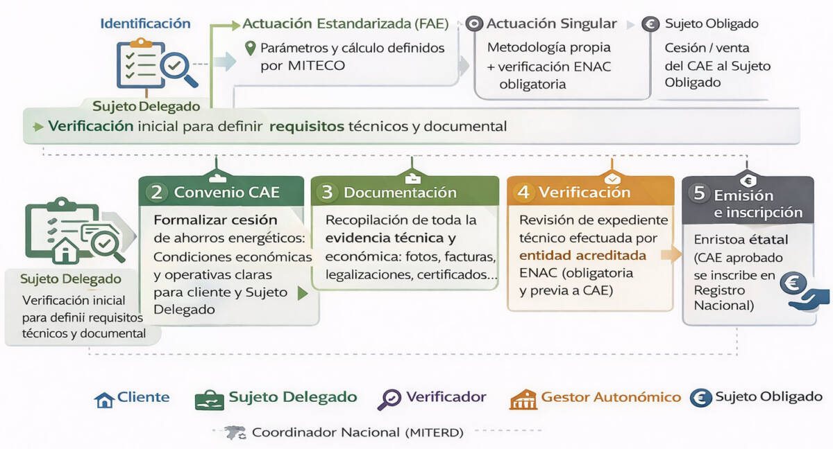 Trámite ante gestor autonómico y registro nacional. Una vez obtenida la verificación favorable por parte de la entidad acreditada ENAC, el expediente se presenta ante la Administración Autonómica competente (Gestor Autonómico), que es la encargada de emitir e inscribir los Certificados de Ahorro Energético (CAE) en el Registro Nacional gestionado por MITECO.
